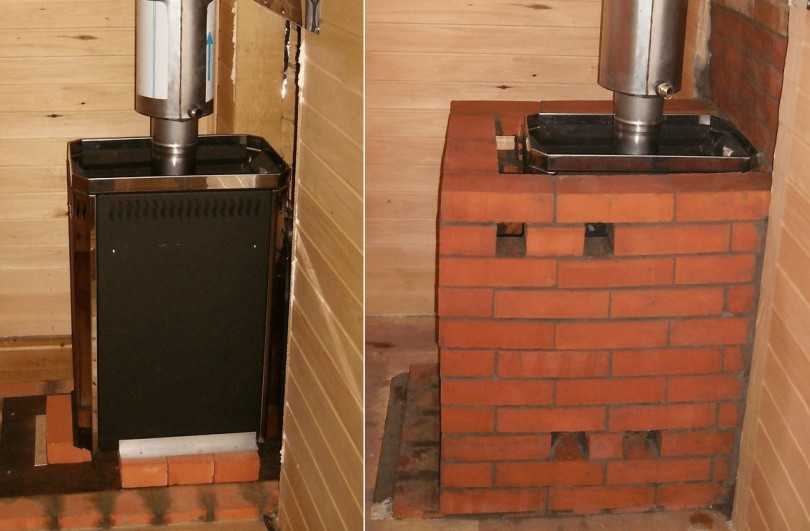 Лучше всего обложить топку кирпичом, это исключит потерю тепла из парной. В предбаннике стены и пол в месте расположения печи закрываются огнестойким материалом.