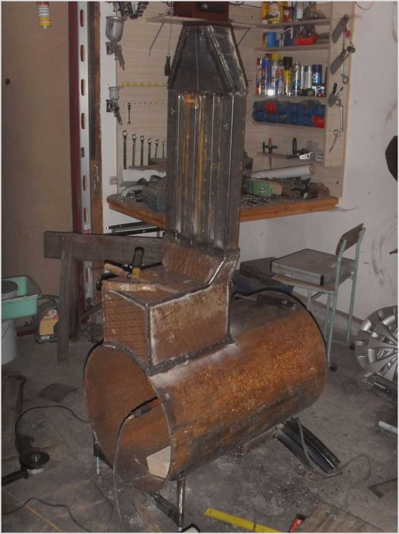 Справка. Чтобы изготовить еще более простую модель, понадобится старый пропановый баллон, который используется в качестве корпуса печи. В торце вырезаются отверстия для дверей топки, зольника. В боковой стенке делается круглый проем для подсоединения дымохода. Сам баллон горизонтально устанавливается на ножки.