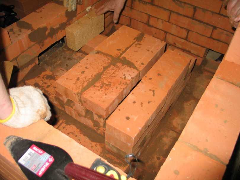 Отопительное устройство может быть с полностью кирпичным дымоходом или трубой. Обычно используют комбинированную версию: до потолка идет кирпич, а дальше асбестовая труба. Кладку кирпичного дымохода начинают с выкладывания ряда перекрывающего зону топки. Сначала идут два воздушных канала, но позже они сходятся в одни. Зона вытяжки постепенно сужается и смещается в сторону. Одна или две задвижки регулируют ширину дымохода и скорость выхода горячего воздуха.