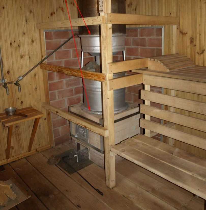 Над топкой устанавливается внутренняя каменка, высотой около 45 см, в корпусе прорезается дверца для закладки камней.