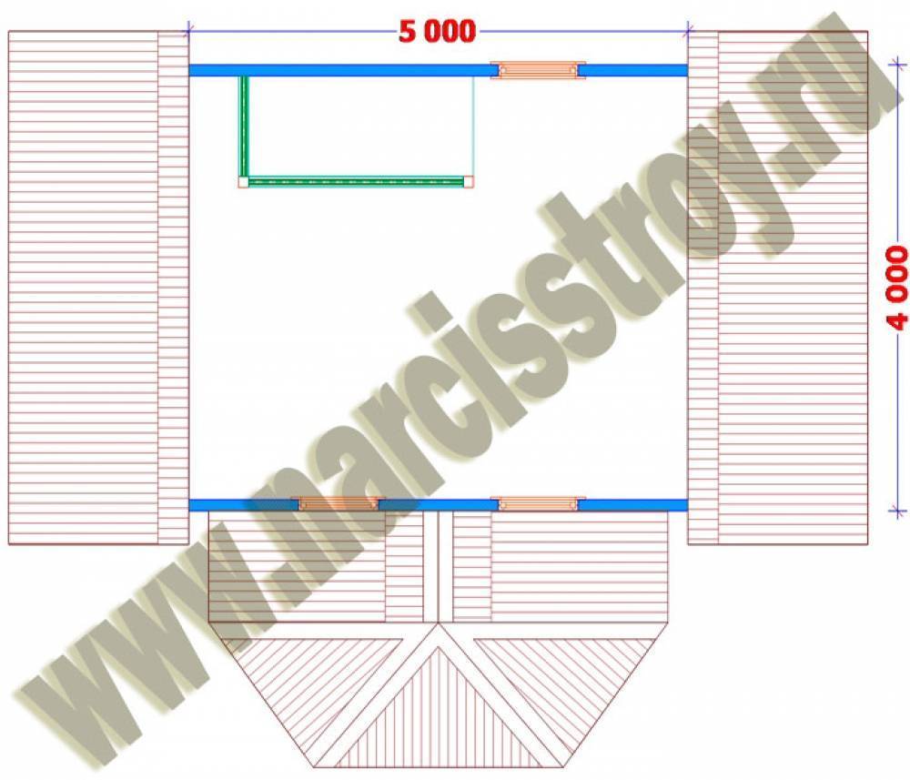 Отталкиваясь от ширины плит (матов) утеплителя (например, 60 см) и толщины стоек каркаса (5 см), получаем: строение 3 × 5 может иметь длину рамы одной стены 5 + (60 + 5) × 5 = 330 (см), другой — 5 + (60 + 5) × 8 = 525 (см). (Сторона сооружения в целом увеличится за счёт решений углов, обшивки и облицовки).