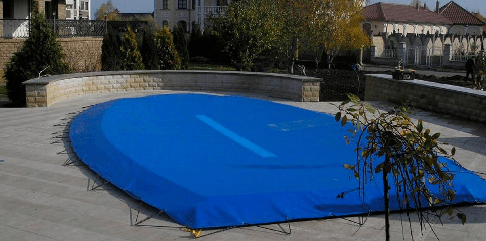 Система водоснабжения должна быть лишена воды. Когда бассейн достаточно просох, его накрывают специальным тентом, который натягивается на чашу бассейна.