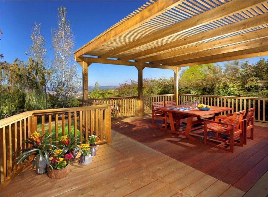 Не будет здесь и остеклительных работ. Открытая беседка – это просто площадка под крышей. От ветра, в такой пристройке, не спастись, зато дождь отдыху помехой не будет. Глядя на вышесказанное становится понятно, что открытые конструкции – сезонная прерогатива.