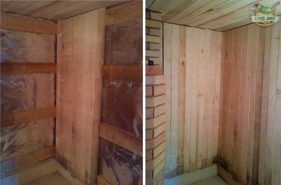 Чтобы конденсат беспрепятственно стекал по фольге и не впитывался в вагонку, был выполнен вентзазор. Для этого обрешетку пришлось «отодвигать» от фольги с помощью заранее прибитых небольших брусков толщиной 2см.