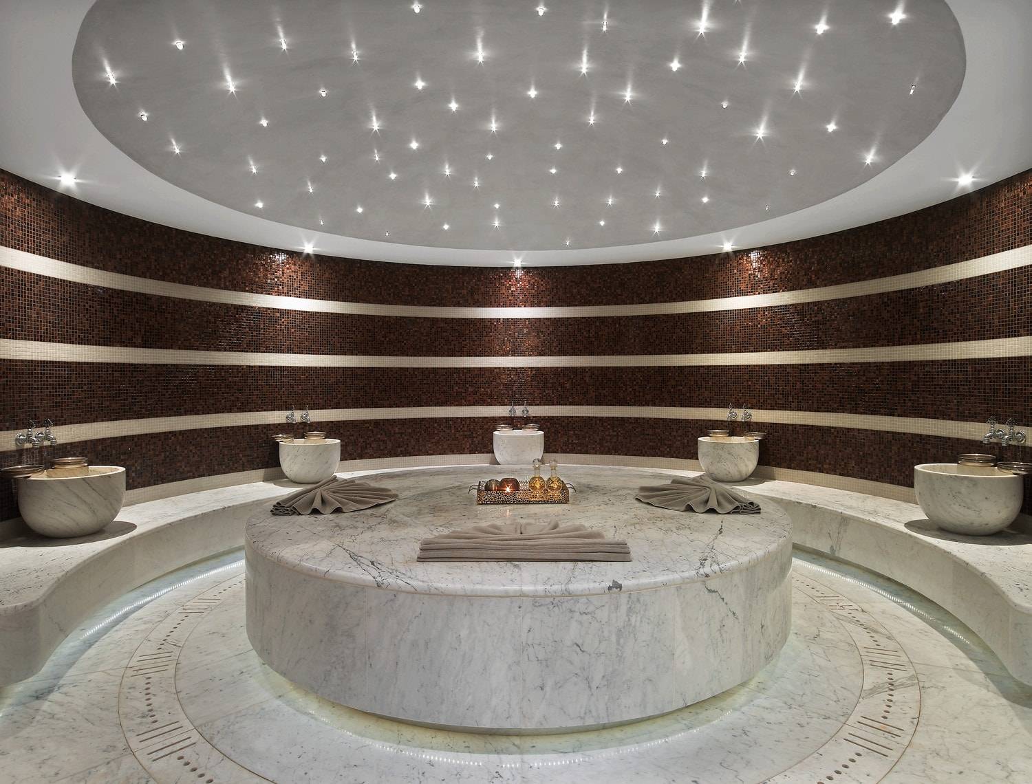 Лежаки и все поверхности настоящей турецкой бани изготовлены из мрамора. Под ним проложены трубы, заполненные горячей водой, благодаря чему камень нагревается и от него исходит приятное мягкое тепло. Поэтому помещение равномерно прогревается, холод задерживается только у потолка.