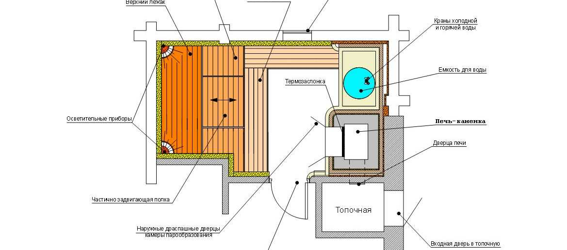 - помывочная – предназначена для купания с применением химических средств личной гигиены, поэтому там располагаются лавочки для размещения тазов и ведер, но в современных условиях такие помещения обустраивают ванной или душевой кабиной. Также там должны быть шкафчики и полочки для размещения емкостей с мылом, гелями, шампунем и другими средствами.