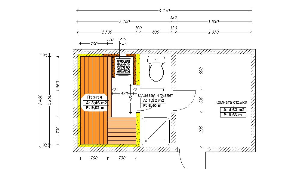 - Площадь парного отделения, исходя из возможности одновременного нахождения в нем 2 человек не может быть менее 4 кв. м. Эта площадь позволит принимать процедуры лежа, а также использовать веники;
