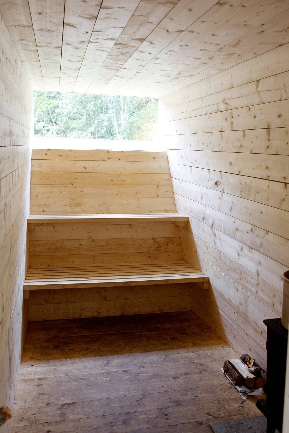 Классическая финская баня меньше русской. Ее проект предусматривает всего лишь два помещения – парную и многофункциональную комнату (раздевалка, помещение для отдыха, совмещенное с душем). Потолок высотой 200-250 см предполагает установку параллельных полок – для сидения и лежания.