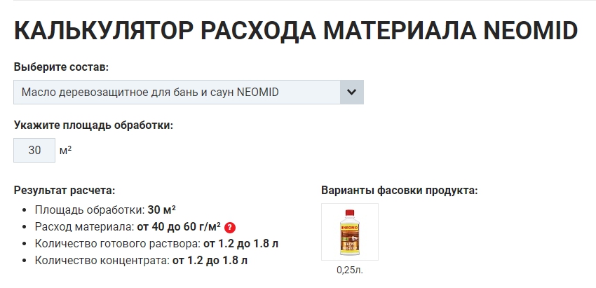 В местном строительном супермаркете на выбор было порядка 8 составов разной ценовой категории. Клиент остановил свой выбор на продукции компании НЕОМИД, а именно на масле для бань и саун. Цена за флакончик 0,25 л весной 2017 года составила 270 рублей.