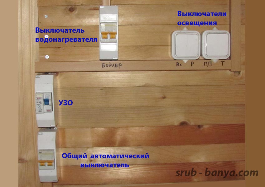Выключатели освещения. После УЗО — выключатели освещения и водонагревателя. От выключателей освещения провода подводятся к каждому светильнику. В бане всего 4 светильника. Два — в комнате отдыха (можно один) и по одному в моечной и парилке. |