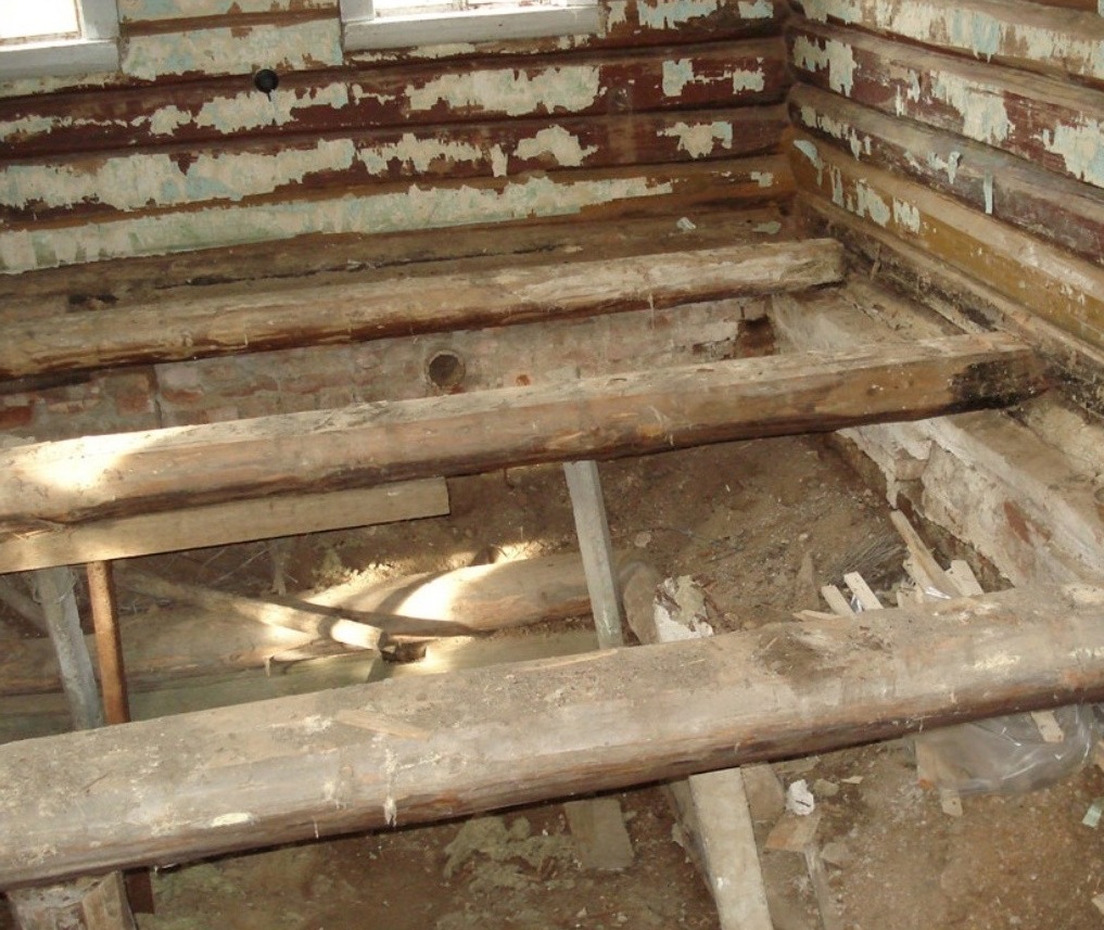 Если гниению подверглись лаги, закладные венцы, черновое или финишное покрытие, то их следует незамедлительно заменить. В этом случае весь пол нужно будет поднять домкратом, нижнюю часть сруба удалить по частям, старые закладные балки заменить на новые.