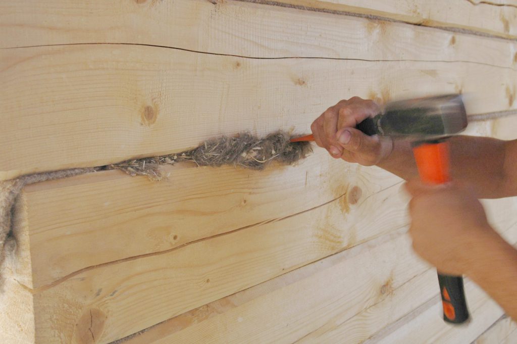 Выявив щели между бревнами, тщательно конопатим, добиваясь герметичности.