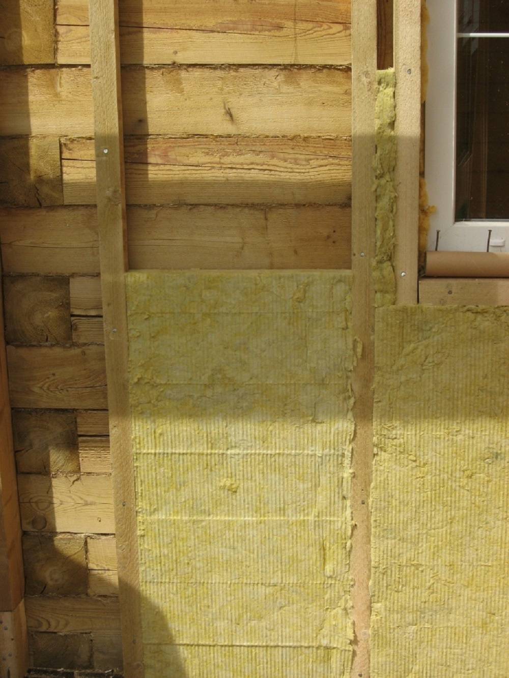 Произвести выравнивание стены можно брусками, которые стоит набивать на бревна вертикально. Затем уложить слой пароизоляционного материала. Этот материал крепится к брусам и стенам. Затем нужно уложить слой утеплительного материала.