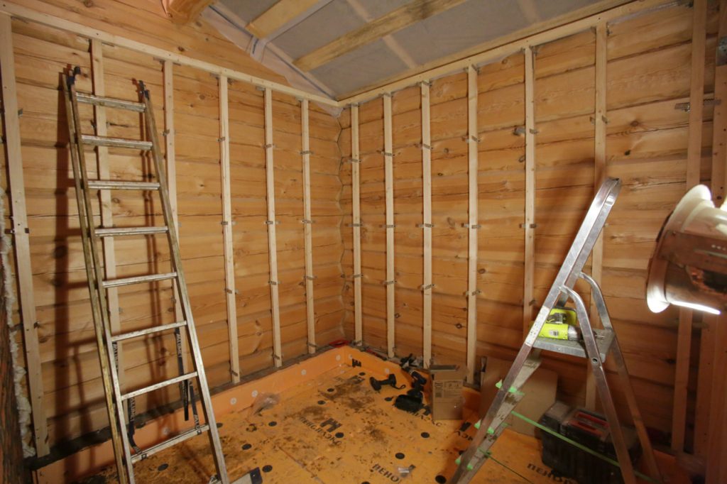 Постройки из труса и бревна не имеют идеальной геометрии, поэтому первый этап работ заключается в установке каркаса из брусков на стенах и потолке. Приобретайте материал камерной сушки, т.к. он более стабилен к колебаниям влажности. Сухой брусок не «ведет», что позитивно влияет на качество финишной отделки.