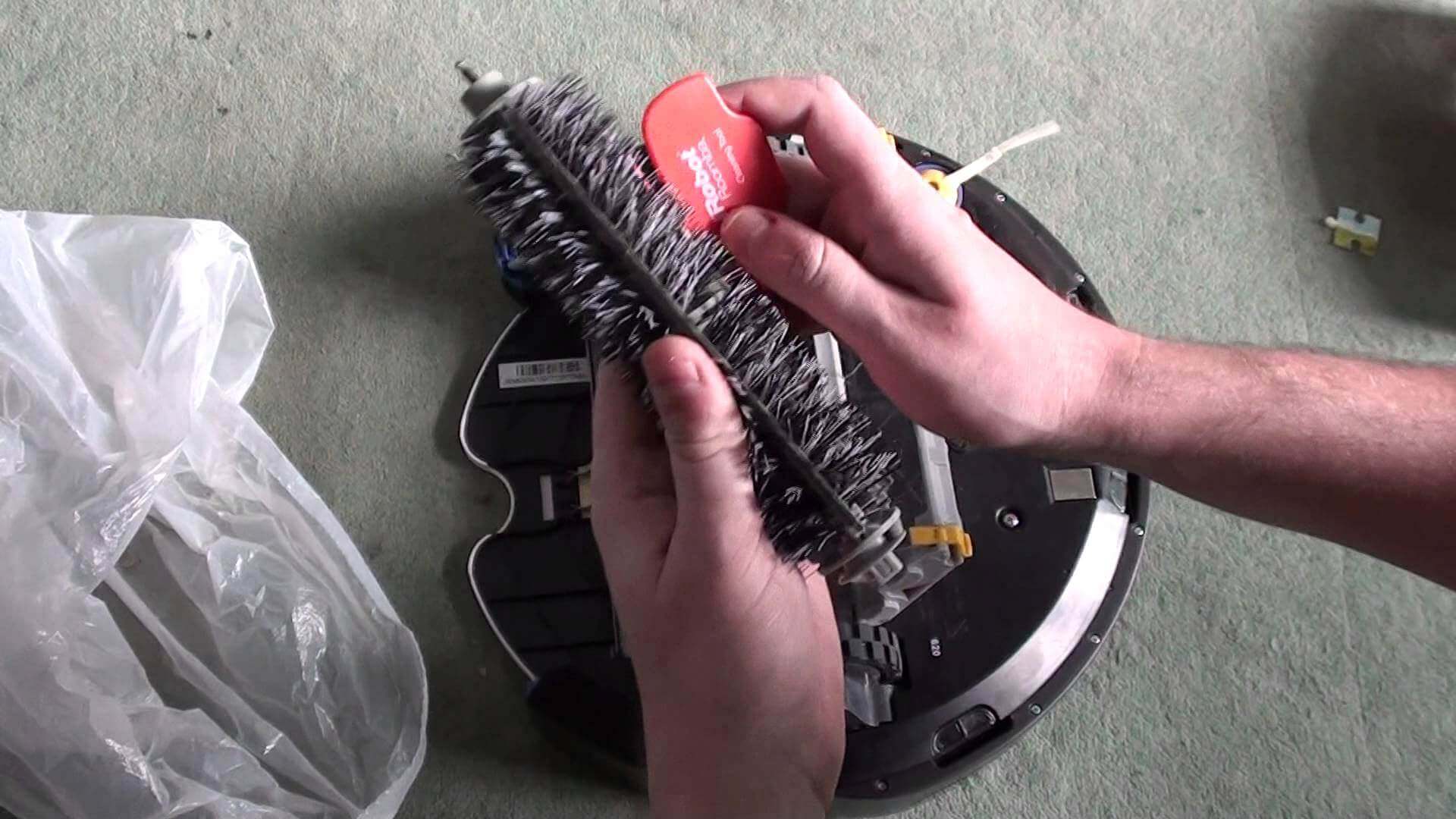 Далее рассмотрим, как почистить турбощётку робота-пылесоса от волос и накопившейся шерсти, если у вас имеются домашние животные. В некоторых моделях таких щёток может быть две. Конфигурация и метод установки данной щётки может отличаться, в зависимости от производителя. Однако, в любом случае, перед началом очистки турбощётки её нужно извлечь из робота-пылесоса.
