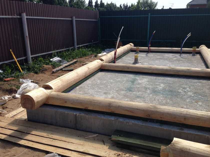 - Перед кладкой венцов, нужно покрыть бетонное основание жидкой мастикой и разложить 2 слоя рубероида.