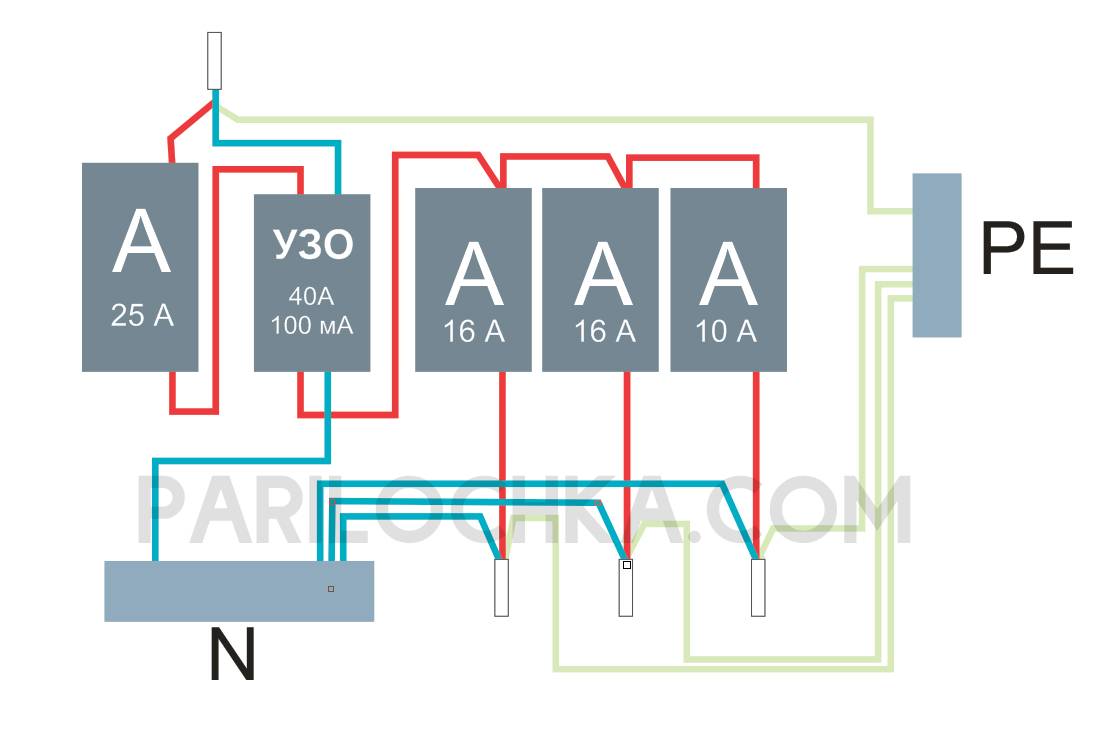 Рассмотрим подключение на 220 В. Вводный автомат на 25 А ставится на провод фазы. Далее на провода нуля и фазы ставится УЗО (40А, 100 мА), после чего провод нуля подсоединяется к шине N. Затем на три группы потребителей ставятся три автомата – последовательно на провод фазы. К каждой группе потребителей с шин N и РЕ идет свой провод, так, чтобы к потребителю шло по три провода – фаза, нуль и земля. Ниже картинка, иллюстрирующая приведенную схему.