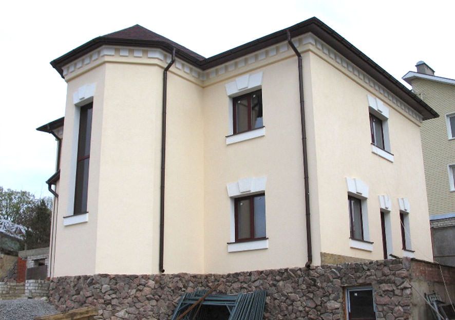 - Декоративная штукатурка рассчитывается по площади фасада с запасом не более десяти процентов на обработку откосов в оконных и дверных проемах.