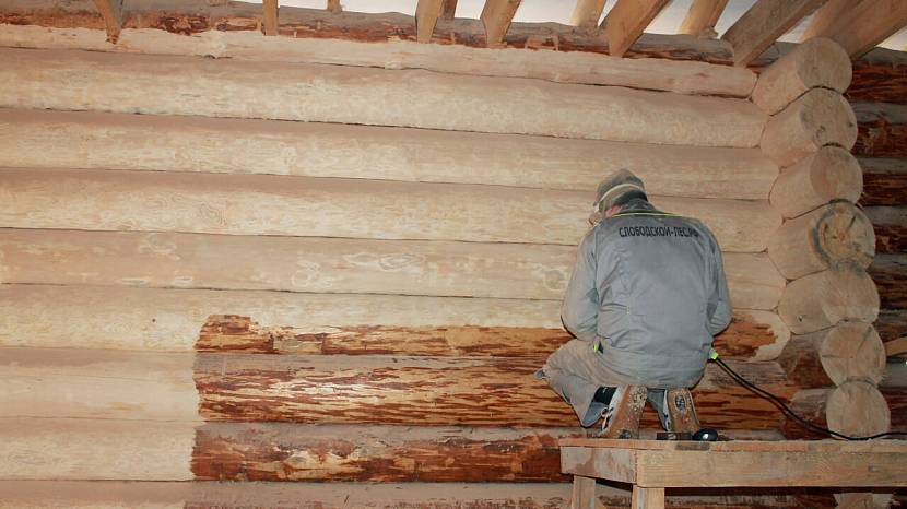 - выровнять поверхность брёвен или брусьев, сделать ее идеально гладкой;