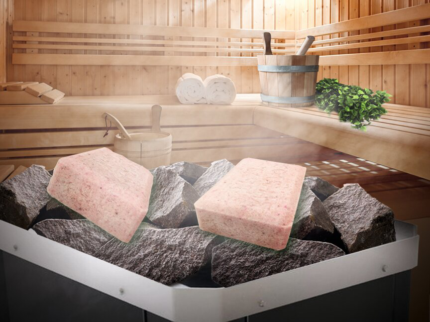 Благодаря насыщению воздуха полезными микроэлементами, имеющимися в соли, соляная сауна оказывает заметное лечебное действие на весь организм, а особенно на дыхательные пути. Максимальный эффект и наибольшее выделение микроэлементов из соли происходит при ее нагреве до 60°С (влажность должна быть от 20 до 40%). В воздух поступают соединения бария, железа, магния, йода, кальция, марганца и особыми соединениями хлора. Но при повышении влажности до 74% соль превращается в раствор. В банях тоже используют соляные кирпичи, но для этого там устанавливают специальную систему вентиляции, которая будет хорошо проветривать помещение и осушать его.