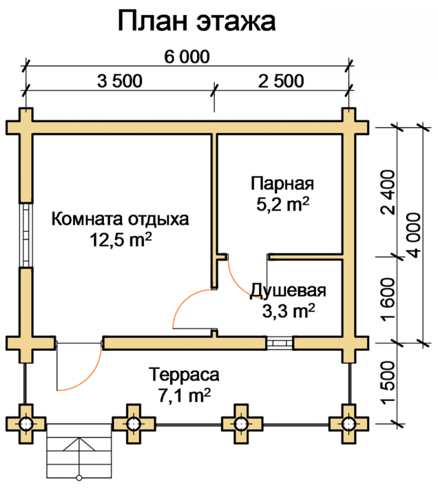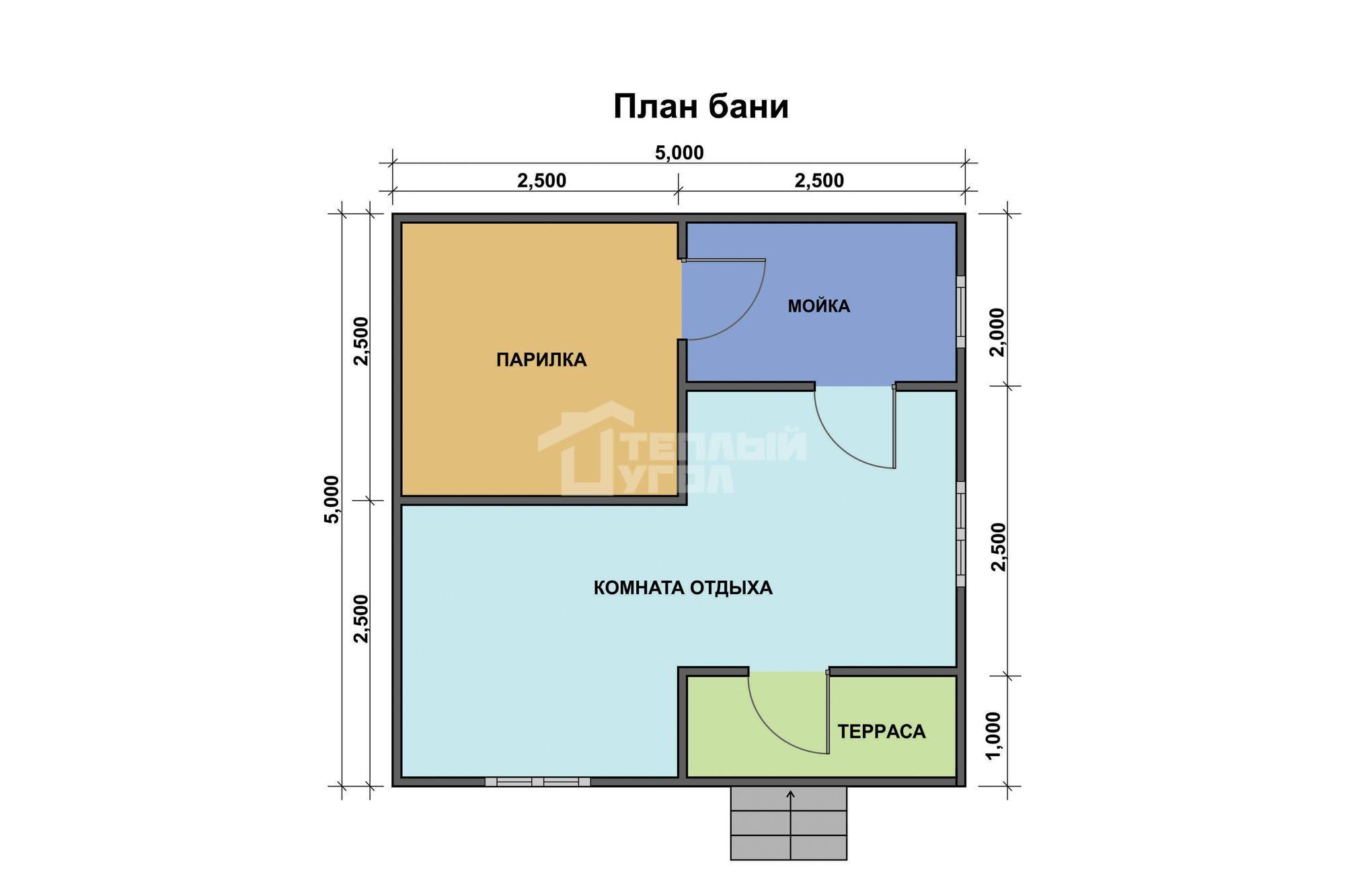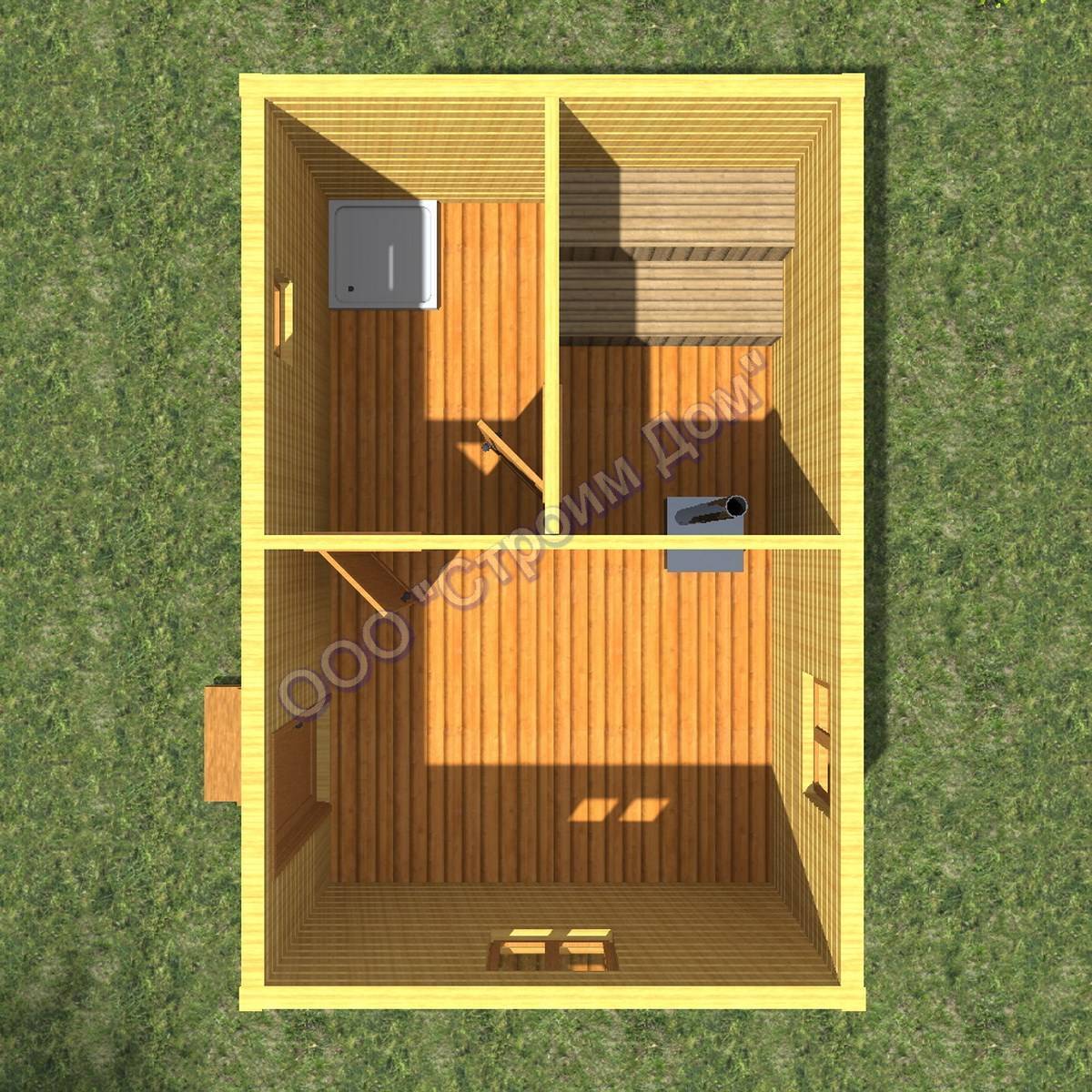 Проект с размещением функциональных зон для просторной квадратной бани.