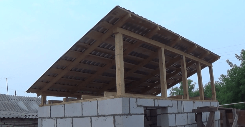 Шаг 3. Укладываем стропила (прямые доски ставим на ребро и крепим перфорированными уголками к горизонтальным брусьям переднего и заднего каркасов).