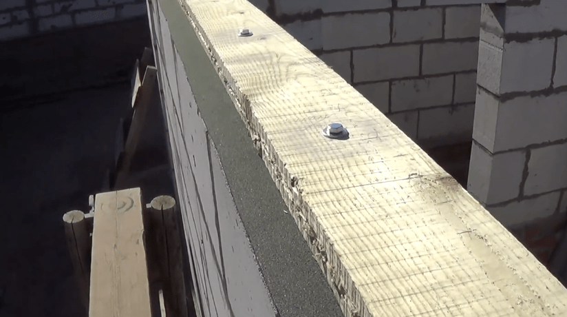 Шаг 1. Поверх армопояса крепим мауэрлат. Он представляет собой доску, зафиксированную дюбелями (глухарями).