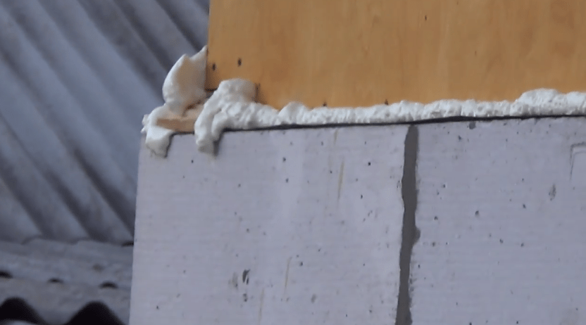 Шаг 9. Запениваем щели между блоками и фанерой.