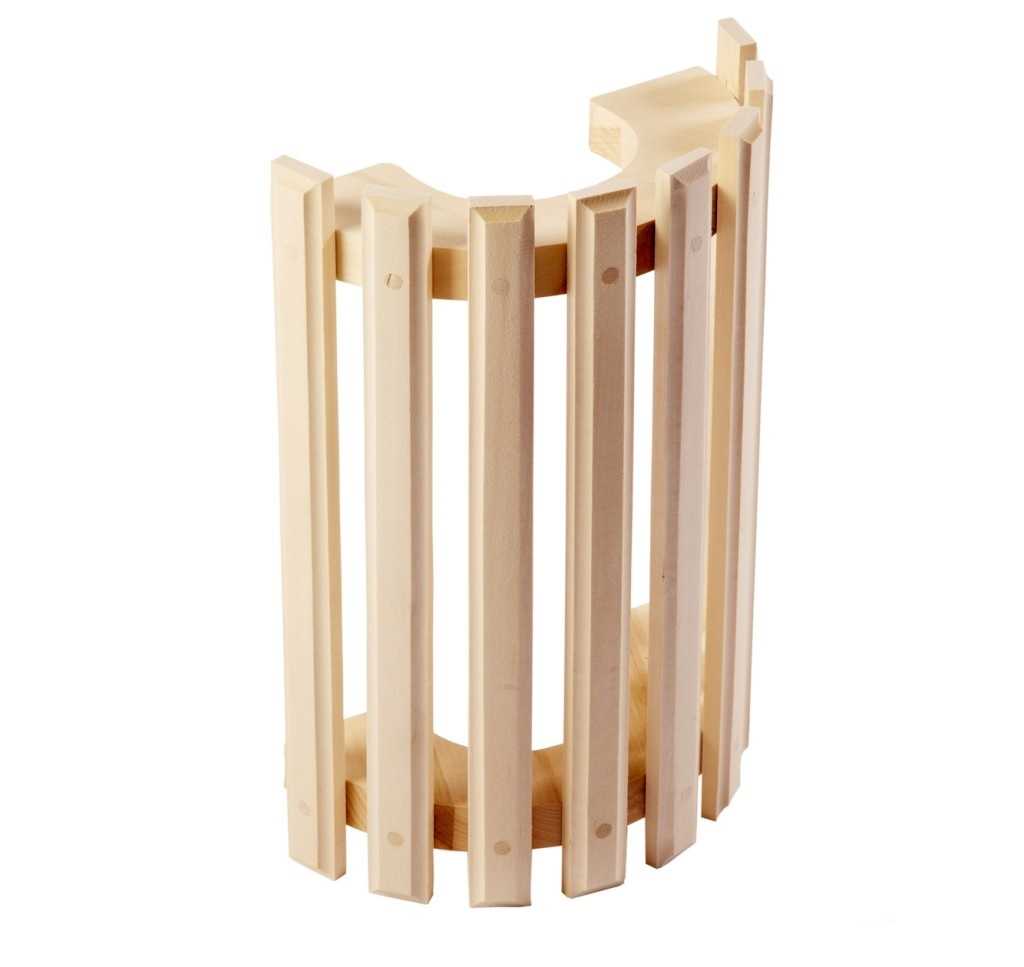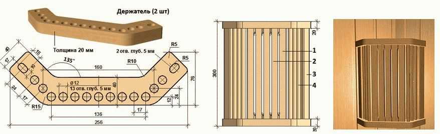 На потолке в бане размещать осветительные приборы не принято, особенно в парилке, там максимальная температура бывает выше 120 °С. Обычно это делается на стенах по углам, на высоте 1.8–2 м. Исходя из этого, форма абажура должна быть полукруглая или п-образная, такая, которой можно накрыть источник света на стене. Изготовить деревянный абажур в виде решетки несложно.