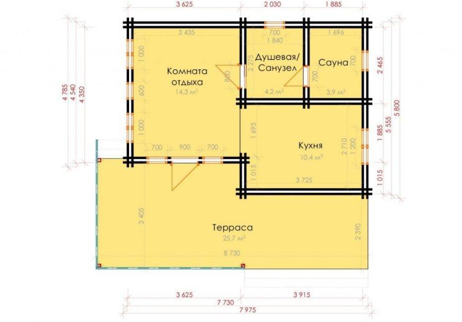 Важно! Размеры комнаты отдыха определяют по габаритам бани. Минимальной считают площадь, которая равна 10 кв