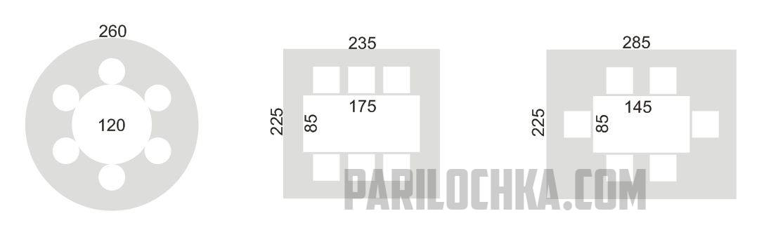 Шестиместные – трех видов. Круг: диаметр 120, пятно 260, прямоугольник параллельная рассадка – 85х175, пятно – 235х225 см, по периметру – 85х145 см, пятно – 285х225 см.