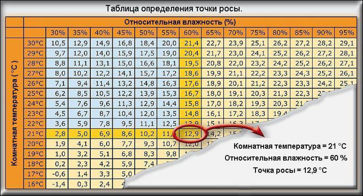 Таблица определения точки росы в зависимости от температуры воздуха и влажности.