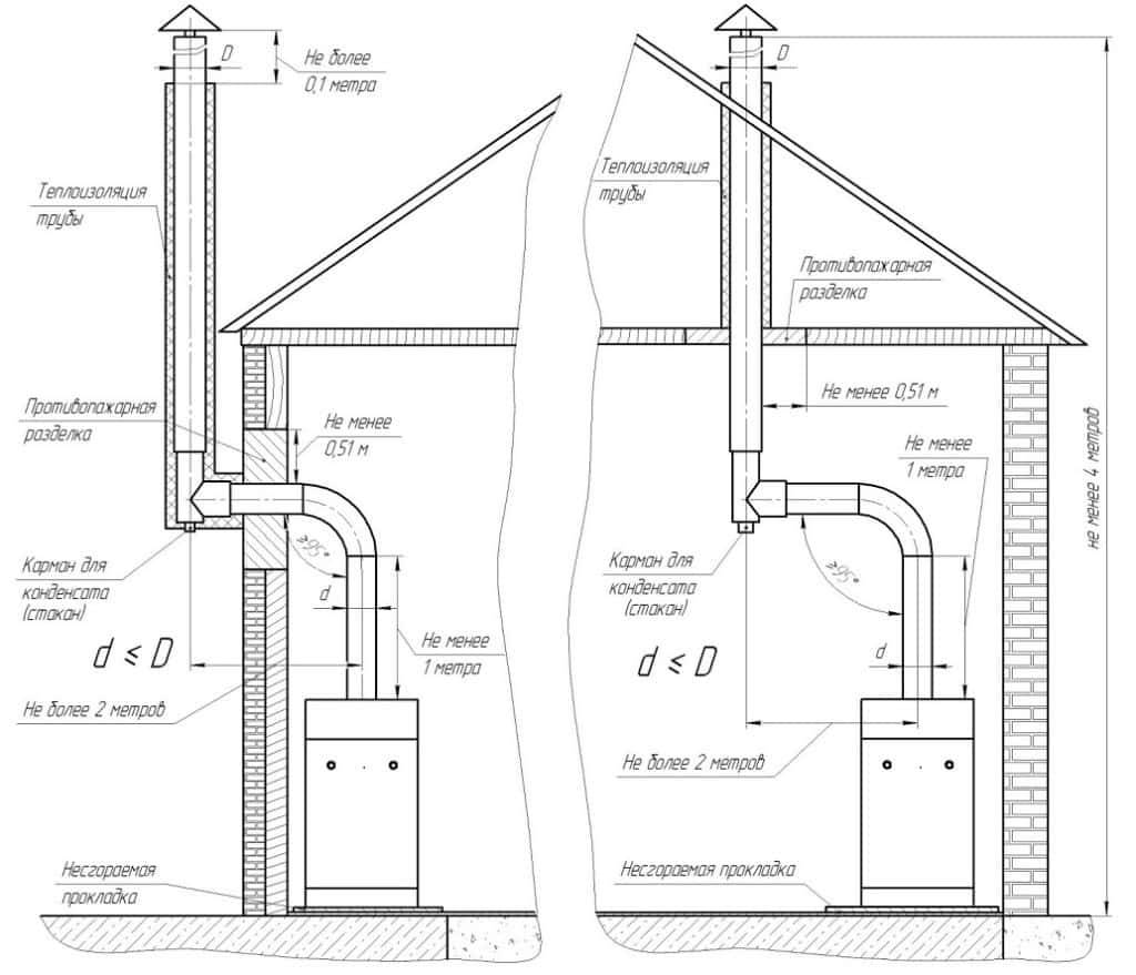 - Не допускается соприкосновение дымового канала с любыми коммуникациями: газовой трубой, электропроводкой и т. п.