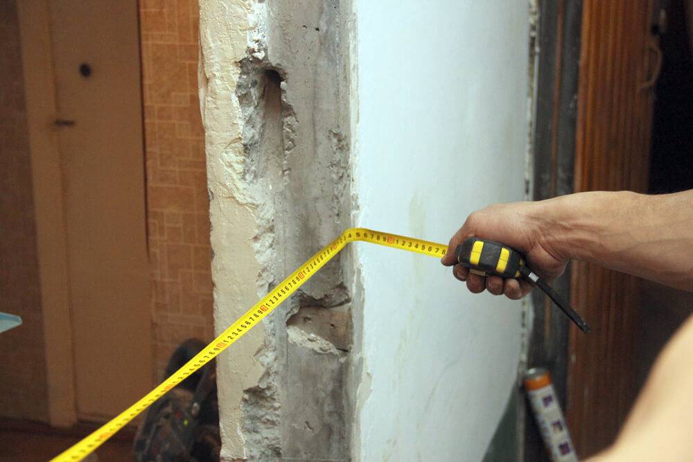 В новостройках дверные проёмы теоретически должны иметь размеры, близкие к стандартным. Однако на практике так случается далеко не всегда. В доме или квартире, где происходит реконструкция, перед установкой новых нужно демонтировать старые двери. Если при этом проём был повреждён, его необходимо восстановить — выровнять и оштукатурить.