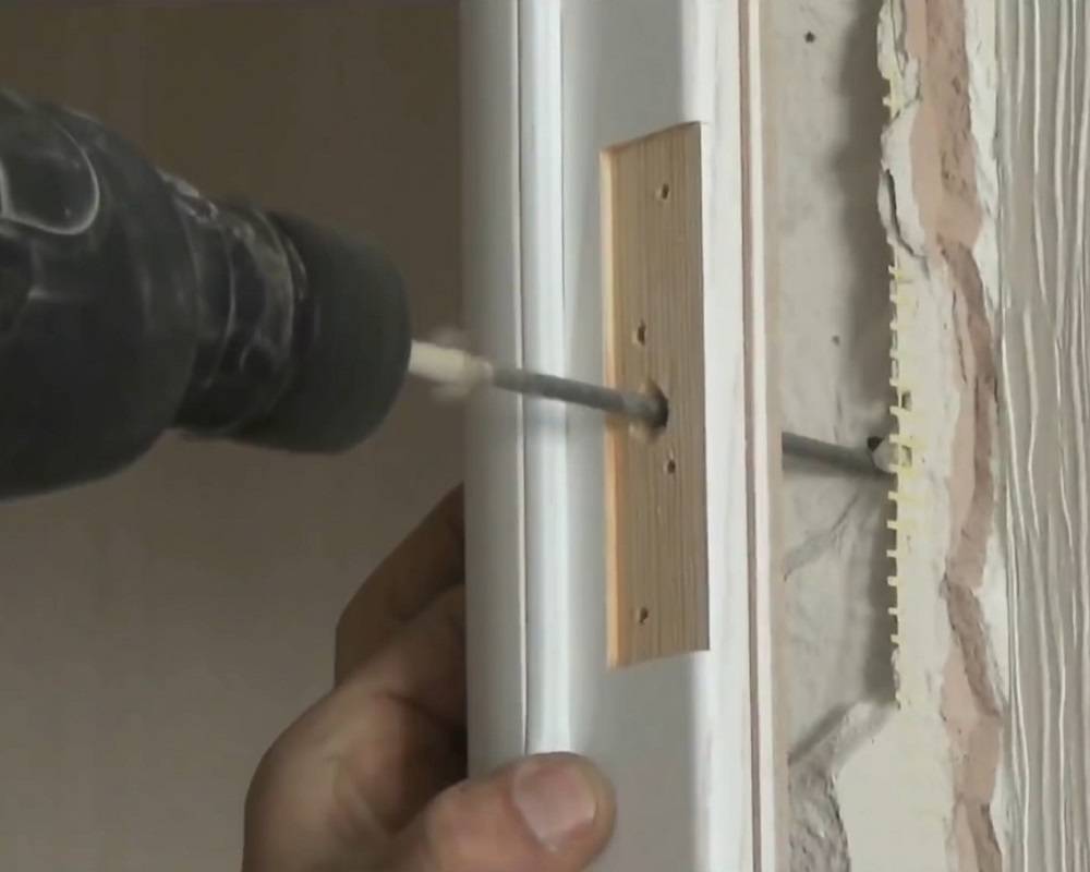 Выполняется разметка участков крепления коробки к стене проема. В этих местах сверлятся отверстия в элементах короба и в самой стене.