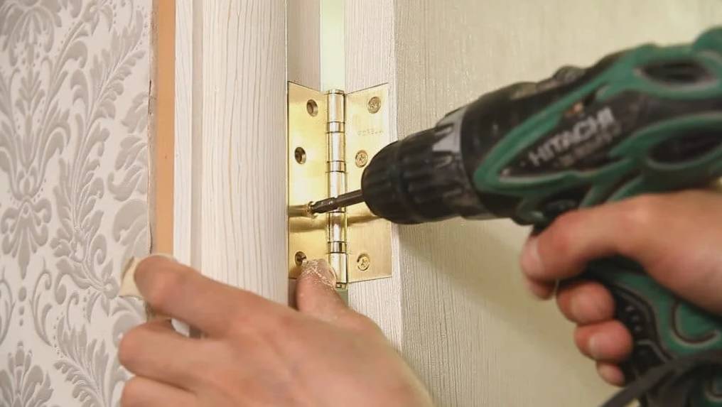 Устанавливаются и закручиваются саморезами дверные петли, навешивается полотно. Если монтаж коробки был выполнен правильно без нарушения горизонтальности и вертикальности конструкции, двери должны легко открываться и закрываться.