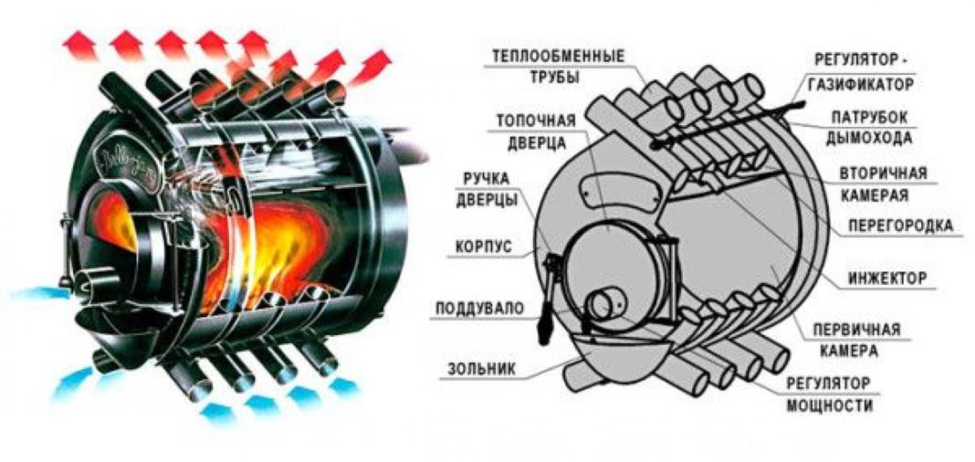Топка отопительного агрегата представляет собой металлический цилиндр, с двух сторон которого через одинаковые промежутки врезаны трубчатые металлические теплообменники, изогнутые в виде колен. Благодаря тому, что две трети диаметра труб утоплены в тело печи и находятся в зоне горения, воздух получает до 70% тепла, которое выделяется при сжигании дров. Оставшиеся килокалории нагревают тело печки и впоследствии также расходуются на обогрев помещения. Благодаря такому распределению корпус булерьяна обычно нагревается всего до 60–65 °С, тогда как воздух, который выходит из конвекционных каналов, имеет температуру более 100 °С. Надо сказать, что именно высокая скорость нагрева обеспечивает активное засасывание холодных воздушных масс в нижней части трубчатых теплообменников и их выброс из верхних проёмов калорифера.