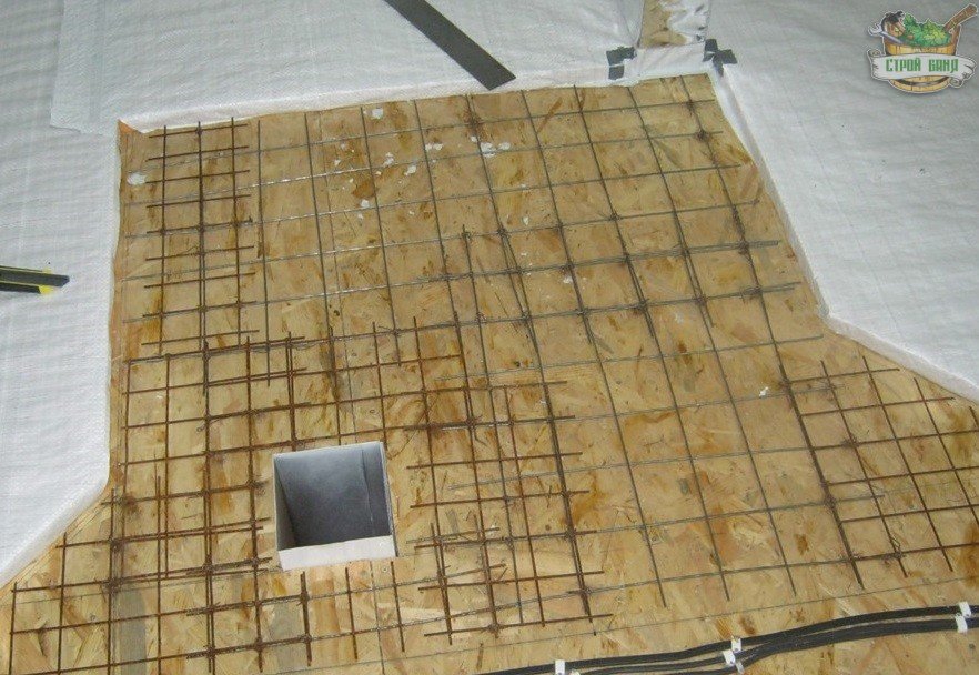 Размеры плиты-фундамента на 15 см превышают габариты кирпичного экрана (вокруг печи) на 15 см. Первым делом в месте расположения плиты создается армирование. На листы OSB-3 уложена сетка, ее части связаны проволокой в единое полотно.