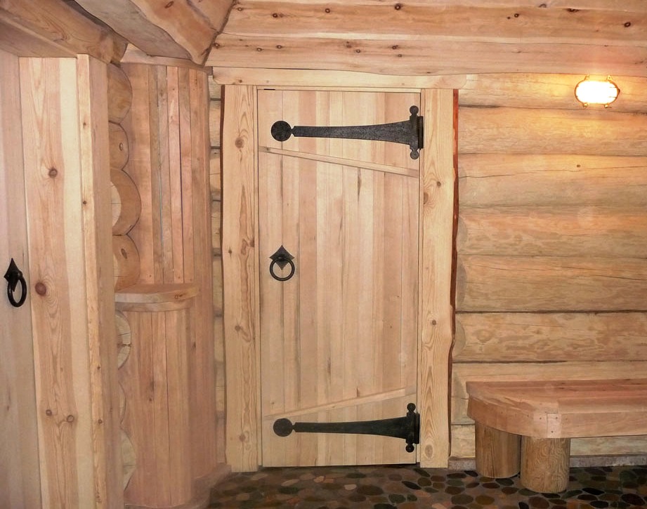 На входе в парную не следует делать большую дверь. Ее порог должен быть выше уровня пола на 25-30 см. Дверное полотно должно быть без щелей. При необходимости его можно утеплить так же, как и стены. Двери должны плотно закрываться, поэтому дверная коробка и полотно должны быть хорошо подогнаны друг к другу. Улучшить теплоизоляцию дверей можно, обив пазы коробки войлоком или сукном. Пространство между проемом и коробкой заполняется минеральной ватой. Утеплитель защищают от влаги, закрывая гидроизоляцией.