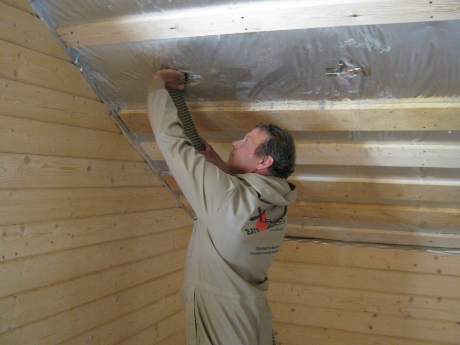 Сквозь слои утеплителя следует провести вентиляционное отверстие диаметром не менее 2 сантиметров. Оно необходимо для выведения пара и конденсата с пароизоляционной мембраны. Эти отверстия проделывают как в верхней, так и в нижней частях на скате кровли. Таким образом, воздух идет снизу вверх вдоль отверстия, собирая по пути лишнюю влагу с пароизоляционной пленки и выводя ее через верхнее отверстие наружу.