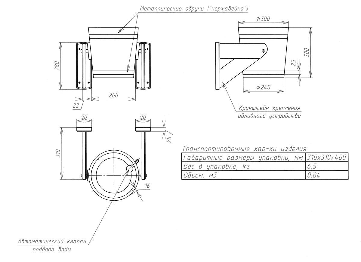 Укрепленный снаружи металлическими кольцами, обливное ведро для бани представляет из себя деревянный резервуар конкретного объема. Готовая конструкция устанавливается в настенном либо потолочном варианте на специальную наклонную систему с помощью металлических кронштейнов.