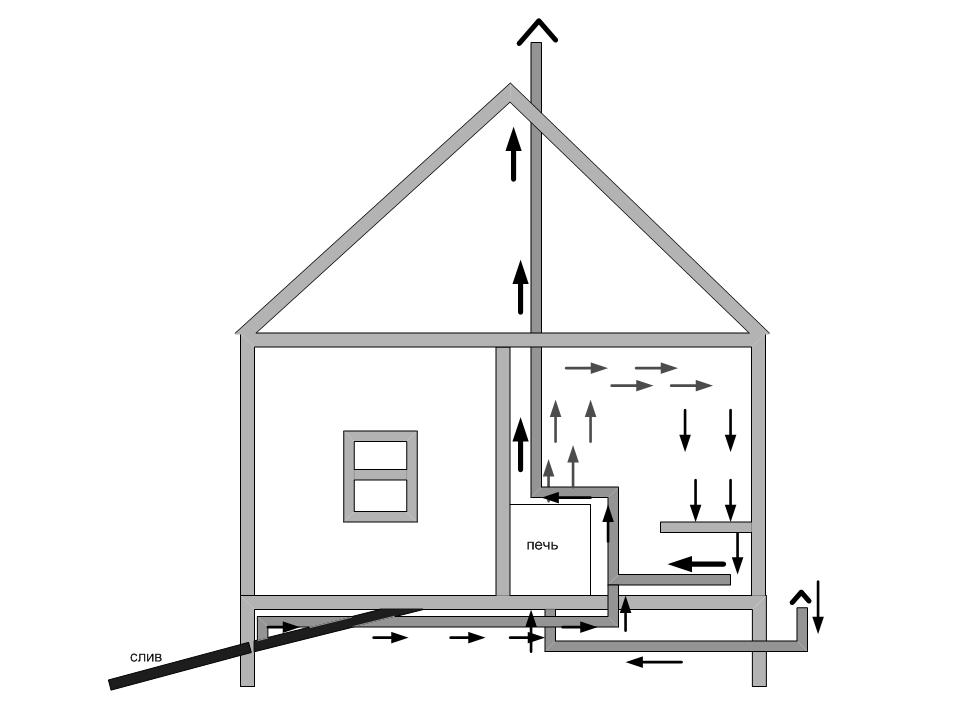 В любом из этих случаев холодный поток, проникающий в помещение, двигается к источнику тепла и вытесняет вверх уже нагретый им воздух. Он при движении прогревает все помещение, постепенно остывая и опускаясь вниз. Здесь он втягивается в поддувало и выводится через дымоход на улицу.