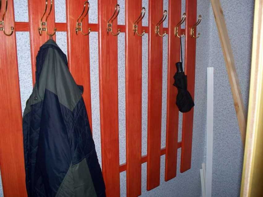 Самый популярный вид вешалок, отличающийся простотой изготовления. Простейшая конструкция состоит из небольшой доски и крючков, крепящихся к одной из ее сторон. В качестве крючков можно использовать обычные деревянные палочки, молотки или дверные ручки. С другой стороны к доске крепятся петли, на которых вешалка и будет держаться.