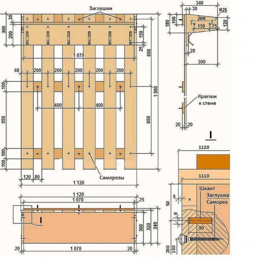 Если вас не устраивает слишком простая конструкция, то можно изготовить вешалку в стиле «забора». Для этого нужно закрепить несколько досок поперечными рейками, оставив небольшие, но одинаковые зазоры. Если верхний край вешалки обычно ровный, то нижний можно сделать фигуристым. Такие конструкции более сложные в изготовлении, поэтому в парилке встречаются не так часто.