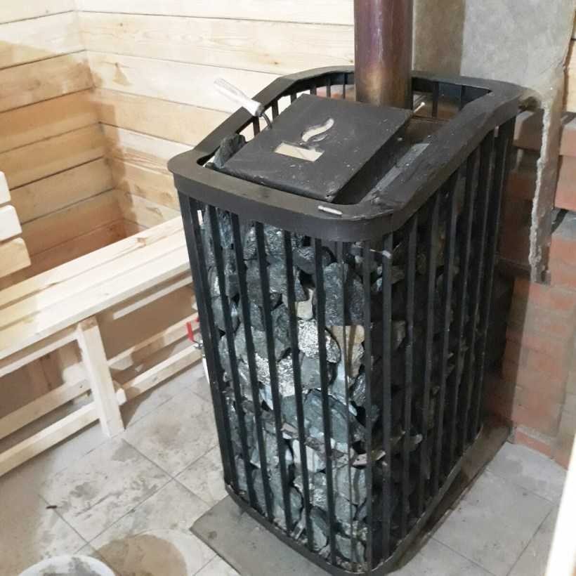 - Через каменку проходит из топки дымоотводная труба. Ее расположение также способствует задержке жара около камней.