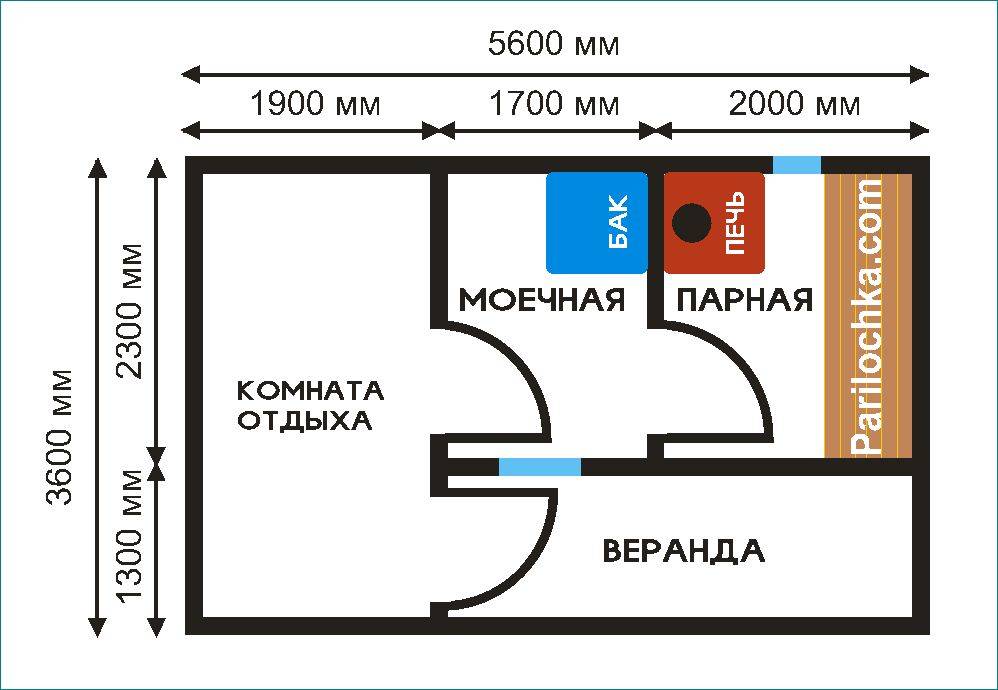 Комната отдыха, моечная и парилка: размеры и планировка.