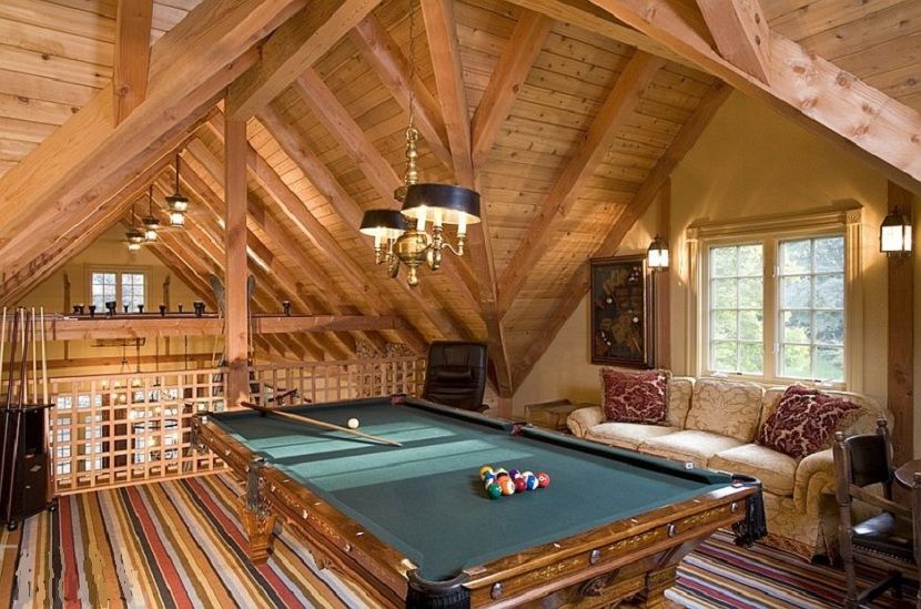 Из мансарды можно сделать и две комнаты, площадь это позволяет. Если планируется приглашать большое количество людей, целесообразнее сделать спальню и развлекательную комнату. Если баню строят больше для хозяев, то во второй комнате можно расположить библиотеку, бильярдную (в зависимости от предпочтений). Можно обустроить ее под место для отдыха.